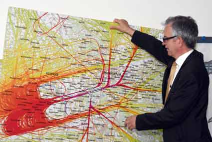 Erwin Stufler, Vorstandsmitglied der Mainzer Bürgerinitiativen, baute eine Info-Karte auf, die Aufschluss über den Fluglärm-Teppich über dem Rhein-Main-Gebiet gab |