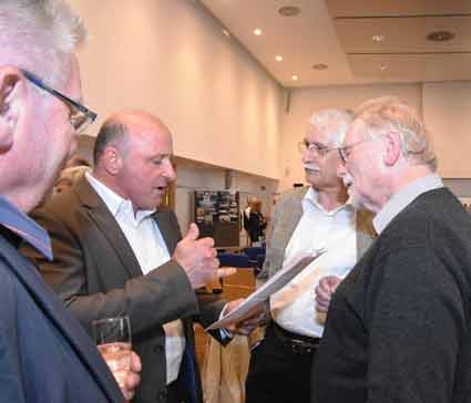 Und nach dem offiziellen Schluss gab es Rande ein spontanes Gipfeltreffen der besonderen Art zwischen (von links) dem Vorsitzenden der Fluglärm-Kommission, Thomas Jühe, sowie den beiden Sprechern des Bündnisses der Bürgerinitiativen (BBI), Thomas Scheffler und Dietrich Elsner. Das Thema: die jüngsten Verstimmungen zwischen beiden Gruppierungen wegen der Neustrukturierung der Fluglärm-Kommission und der öffentliche verbale Schlagabtausch dazu. |