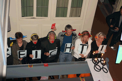 Am Samstag, 19.09. hat Wirtschaftsminister Tarek Al-Wazir an der Eröffnung der Rumpenheimer Kunsttage in Offenbach teilgenommen. Diese Gelegenheit haben einige MitstreiterInnen aus Maintal, dem Kinzigtal und Mühlheim genutzt, um bei seiner Rede in der Schlosskirche eine lautlose Antifluglärm-Performance zu zeigen.