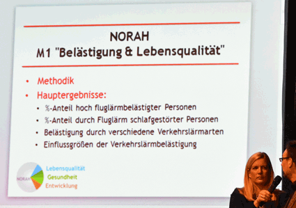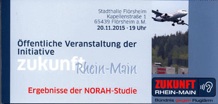 In der Stadthalle Flörsheim wurden bei einer Veranstaltung der "Zukunft Rhein-Main – Bündnis gegen Fluglärm" (ZRM) am Freitagabend (20. November 2015) Ergebnisse der NORAH-Studie über Belastungen im Umfeld des Rhein-Main-Flughafens präsentiert. Dazu berichteten Prof. Dr. Rainer Guski (Ruhr-Universität Bochum), Dirk Schreckenberg (Dipl. Psych. und ZEUS GmbH) sowie Prof. Dr. Peter Lercher (Medizinische Universität Innsbruck). In der NORAH-Studie wurden über mehrere Jahre hinweg detailliert die gesundheitlichen Auswirkungen des Fluglärms auf die Einwohnerschaft des Ballungsgebietes wissenschaftlich untersucht. Dazu gehörten Themen wie Lärm, Erkrankungsrisiken und Belästigungen, sowie die Auswirkungen auf den Schlaf und auch die Lebensqualität. Außerdem saßen in Flörsheim Vertreter/innen von Politik und Ämtern sowie der ZRM auf dem Podium. Die Moderation hatte Beate Höbermann (ZDF) übernommen. In der anschließenden Diskussion gab es eine Reihe kritischer Fragen und Anmerkungen aus dem Publikum.