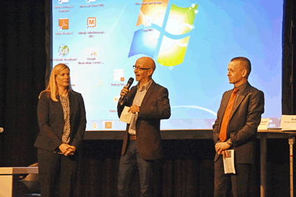 Die Begrüßung (von links): Moderatorin Beate Höbermann (ZDF) mit Sven Heß (Grüne, Erster Stadtrat von Flörsheim) und Thomas Will (SPD, Landrat des Kreises Groß-Gerau)