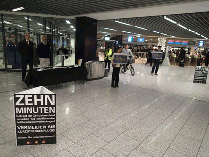 Auf die Reisenden, die heute Morgen für Kurzstrecken-Flüge eingecheckt haben, wartete am Frankfurter Flughafen eine süße Überraschung. Auf dem Weg zur Sicherheitskontrolle erhielten sie von zwei jungen Damen und einem jungen Herrn zunächst eine Karte mit dem Denkanstoß "Zehn Minuten beträgt der Zeitunterschied zwischen einer Flug- und Bahnreise bei Kurzstreckenverbindungen. Vermeiden Sie Kurzstreckenflüge. Reisen Sie umweltbewusst!" Auf der Rückseite der Karte befand sich ein kleines Täfelchen Milka-Schokolade mit einem frechen Spruch, der Kurzstreckenflieger dazu motivieren soll, künftig mit der Bahn zu reisen. Etwa 3000 Karten fanden ihren Abnehmer. Einige Fotos von der Aktion sind beigefügt. Die Aktion war von der Initiative gegen Fluglärm Mainz e.V., Stop Fluglärm e.V. Frankfurt und dem Verein für ein Lebenswertes Mainz und Rheinhessen e.v. vorbereitet und anlässlich des ersten Tages der Weltklimakonferenz in Paris durchgeführt worden. Für die weiteren Tage der Weltklimakonferenz haben die Initiativen ebenfalls morgendliche Mahnwachen angemeldet, um die Flugreisenden mit Informationsbroschüren und Plakatsäulen auf die Klima- und Umweltschädlichkeit des Luftverkehrs hinzuweisen. Dabei wenden sich die Fluglärmgegner insbesondere gegen die "Verdummungskampagne" der Luftverkehrswirtschaft "Wir sind die Vier-Liter-Flieger", die mit Tricksereien versucht, die Luftfahrt als sauberes und energiefreundliches Verkehrsmittel darzustellen.