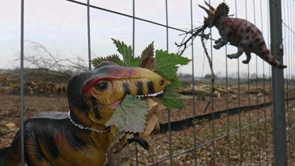 Zwei Plastikdinos hängen im Bauzaun und konsumieren symbolisch Wald. Sie sind einer von den Hinguckern der Kunstaktion "Banner für Bannwald".die am Samstag, den 27.02.2016 stattfand.