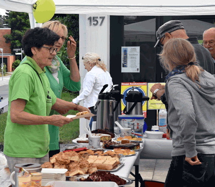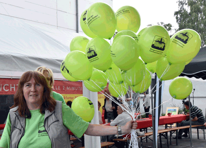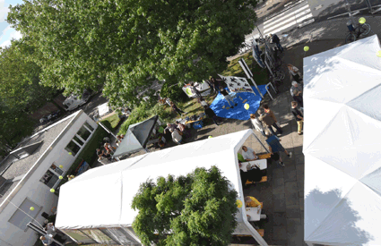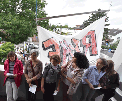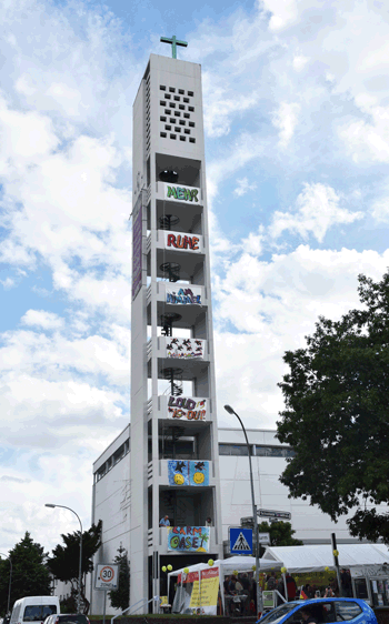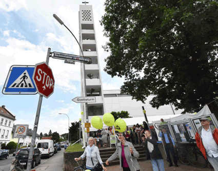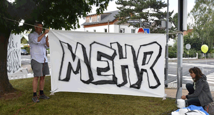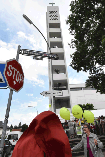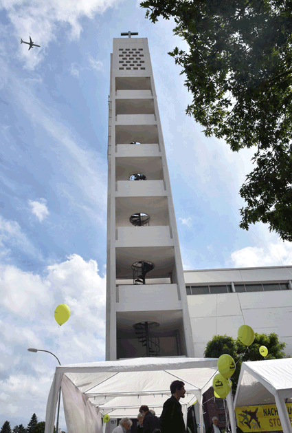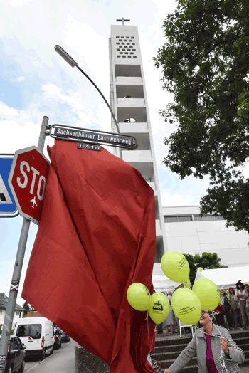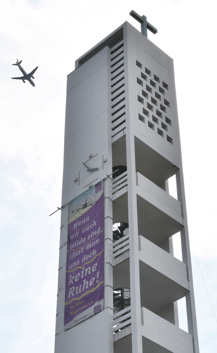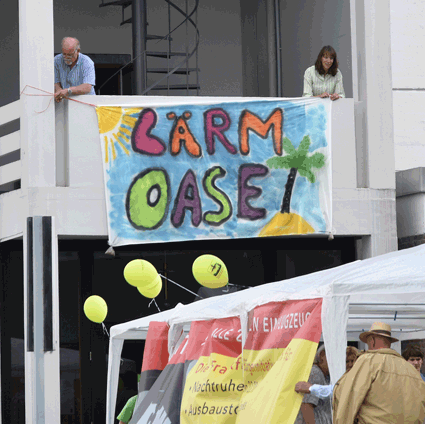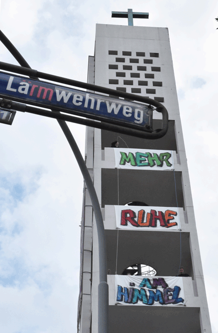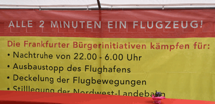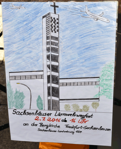 Lärmwehrfest an der Bergkirche Zum nunmehr dritten Lärmwehrfest hatten an die "Berg"-Kirche in Frankfurt-Sachsenhausen für Samstag, 2. Juli 2016, gemeinsam die evangelisch-lutherische Dreikönig-Kirchengemeinde und die Bürgerinitiativen Sachsenhausen (BIS) - im gegen die Umweltbelastungen des Rhein-Main-Flughafens kämpfenden Bündnis der Bürgerinitiativen (BBI) - eingeladen. Dabei wurde der vor der in der Einflugschneise des Airports liegenden Kirche vorbeiführende Landwehrweg befristet und symbolische in "Lärmwehrweg" umbenannt. Dies gab und gibt dem Fest jeweils seinen Namen. Vor allem aber wurden am weithin sichtbaren Kirchturm vor Ort phantasievoll bemalte Protest-Banner emporgezogen, um so den Widerstand gegen die Verlärmung dieses Stadtteils und weiter Bereich des Ballungsgebiets durch auf Rhein-Main andonnernde Jets deutlich zu machen. Abgerundet wurde das Geschehen durch das schon traditionelle Turmgebet mit Pfarrerin Silke Alves-Christe. Außerdem: Musikalisch umrahmt wurde das gut besuchte Fest sowohl durch Steve und Leo Collins mit kritischen Texten zur Gitarre als auch die Trommel- und Gesangsgruppe "Rezaminka" um Monika Plottnik. Engagierte Helfer/innen sorgten mit Gegrilltem, Getränken sowie Kaffee und Kuchen für das leibliche Wohl der großen und kleinen Besucher.