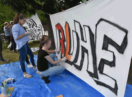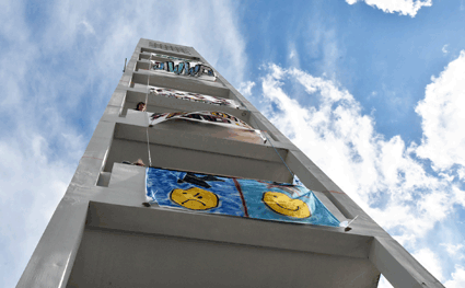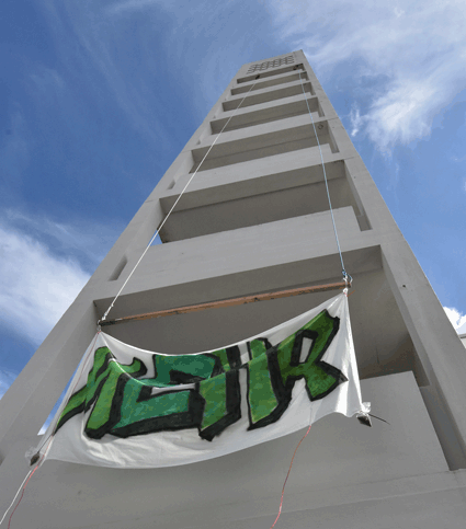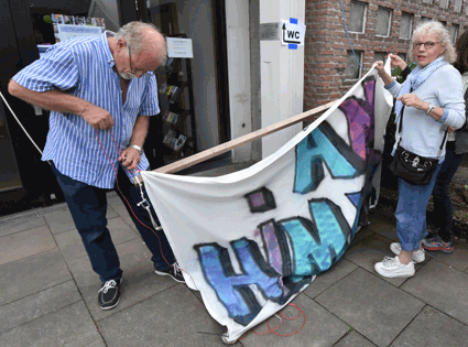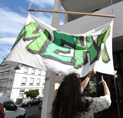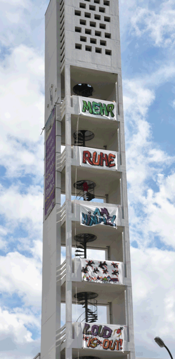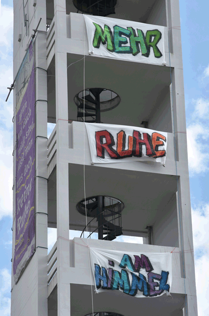 Unsere Bilder 35 bis 47 zeigen Szenen beim Fertigen der großen Banner, mit denen mehr Ruhe am Himmet über Rhein-Main angemahnt wurde, sowie das anschließende Emporziehen und Anbringen am Turm der Bergkirche.