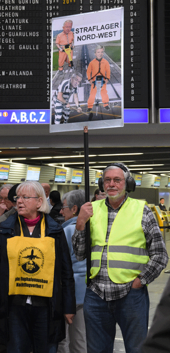 Im Terminal 1 des Frankfurter Flughafens fand am 31. Oktober die insgesamt 189. und nach den Herbstferien erste Montagsdemo des gegen den Ausbau und die Umweltbelastungen des Rhein-Main-Airports kämpfende Bündnis der Bürgerinitiativen (BBI) statt. Im Mittelpunkt standen neben aktuell auf den Halloween-Abend anspielenden Plakaten Redebeiträge von Wolfgang Heubner (Bürgerinitiative Sachsenhausen) und Dr. Berthold Fuld (Bundesvereinigung gegen Fluglärm). Wegen Problemen und Verspätungen im S-Bahn-System gelangten offensichtlich zahlreiche Ausbaugegner/innen nicht oder nicht mehr rechtzeitig zur Montagsdemo ins Terminal. Einige schafften es gerade noch aufgrund kurzfristig improvisierter Auto-Fahrgemeinschaften.