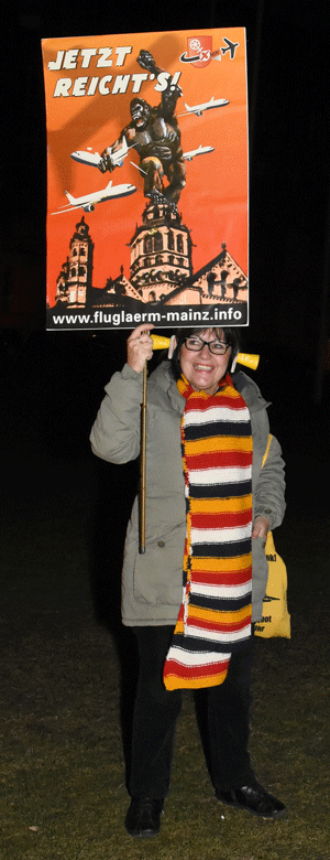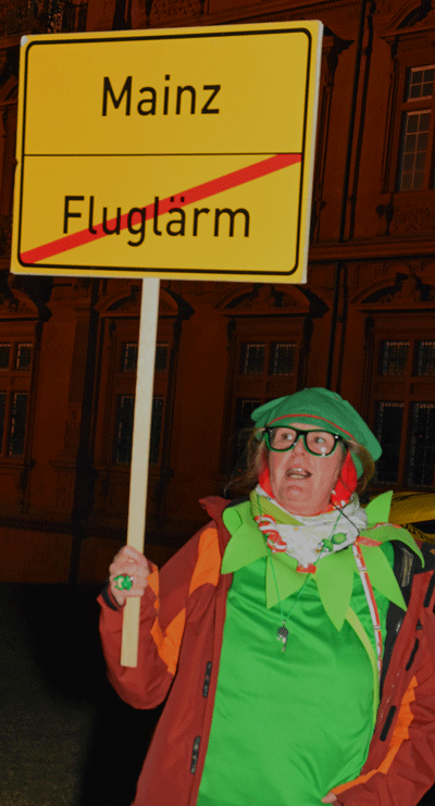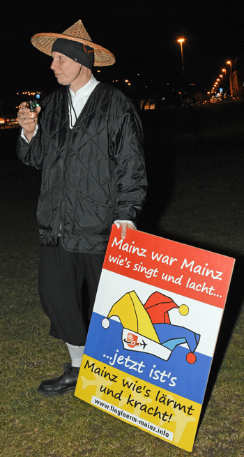 Mit einer fröhlichen Mahnwache wurde am Abend des 24. Februar vor dem kurfürstlichen Schloss in Mainz die bekannte und auch im Fernsehen übertragene Fastnachtssitzung “Mainz bleibt Mainz, wie es singt und lacht” von rund 60 Aktiven der gegen den Ausbau und die Umweltbelastungen des Rhein-Main-Flughafens kämpfenden Bürgerinitiativen begleitet. Dazu hatten die Ausbaugegner/innen das Sitzungsmotto ironisch umgewandelt in “Mainz wie’s lärmt und kracht”. Die BI-Aktivisten, teilweise selbst maskiert und mit Spruchbändern versehen, bildeten am Haupteingang zum Schloss ein fröhliches Spalier, das die Besucher – darunter auch reichlich Prominenz – auf dem Weg zur Sitzung passieren mussten. Insgesamt herrschte freundlich entspannte Atmosphäre nach bester Meenzer Fastnachts-Tradition.