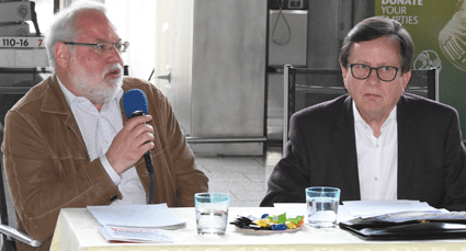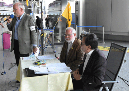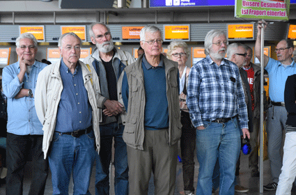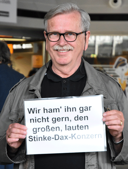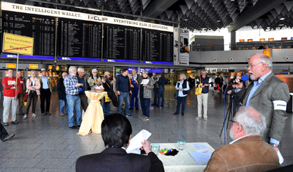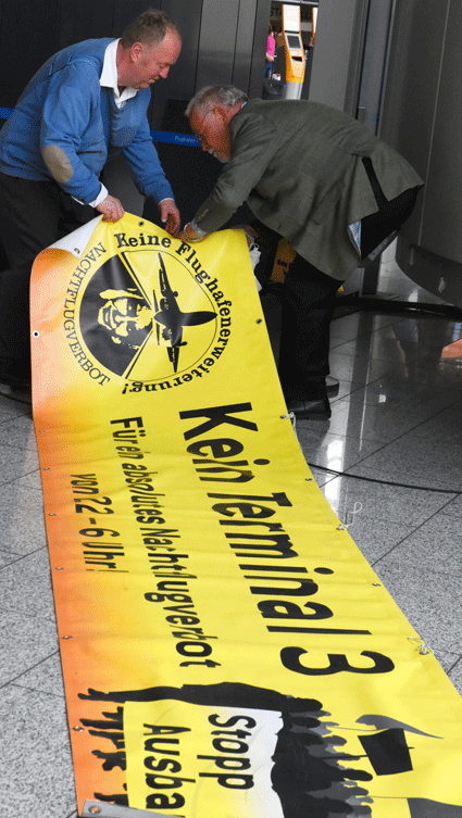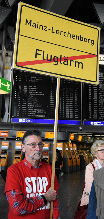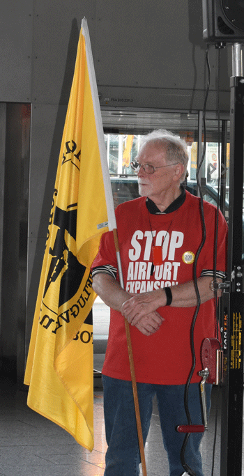 Helmut Mader (BI Niederrad) interviewte bei der 53. Mahnwache des gegen Ausbau und Umweltbelastungen des Rhein-Main-Flughafens kämpfenden Bündnisses der Bürgerinitiativen (BBI) den hessischen Landtagsabgeordneten Hermann Schaus (Linke). Der gilt als langjähriger Unterstützer der Protestbewegung und hat an zahlreichen Demonstrationen und Kundgebungen teilgenommen. Bei der 53. Mahnwache ergab sich eine große inhaltliche Übereinstimmung zwischen Bürgerinitiativen und Linke-Landtagsfraktion. Dazu zählte unter anderem die Ablehnung von staatlichen Subventionen für den Luftverkehr, wodurch Flüge billig gemacht würden. So werde beispielsweise das Flugbenzin Kerosin nicht besteuert. – Die 53. Mahnwache am Montag, 10. April, im Terminal des Airports war die letzte in den Osterferien. Am kommenden Ostermontag findet keine Protestaktion des BBI statt. Die Reihe der regulären, größeren Montagsdemos wird wieder am 24. April, 18 Uhr, aufgenommen.