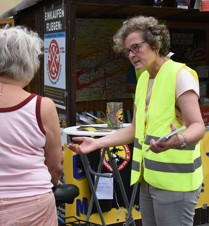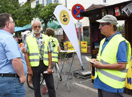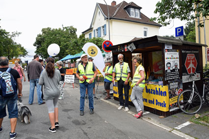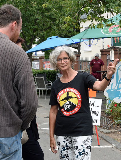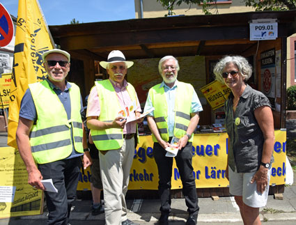 Enorm war der Einsatz der vielen Ehrenamtlichen am BBI-Stand auf dem am Sonntag, 18. Juni, endenden Hessentag 2017 in Rüsselsheim. Leider können wir nicht alle, aber zumindest stellvertretend für alle einige dieser Aktiven hier abbilden. Unsere Foto zeigen Szenen rund um den BBI-Stand in der Ludwig-Dörffler-Allee - am Donnerstag, Freitag und Samstag. Trotz teilweise schweißtreibender hochsommerlicher Temperaturen, gegen die mit phantasievollen Kopfbedeckungen angekämpft wurde, war zu jedem Zeitpunkt eine gute personelle Ausstattung mit Helfern über die vielen Stunden hinweg gewährleistet. Und zum "Lohn" gab es großes Interesse der Passanten und viele gute Gespräche, bei denen die aus unterschiedlichen lokalen BI-Gruppen kommenden Aktiven klar machten, warum der Einsatz gegen Fluglärm sowie den weiteren Flughafenausbau lohnt, vor allem auch weiterhin notwendig ist.
