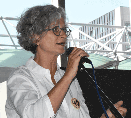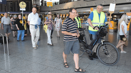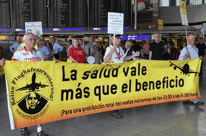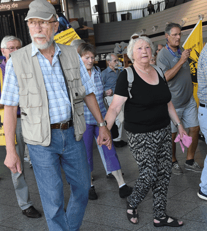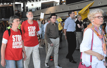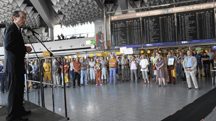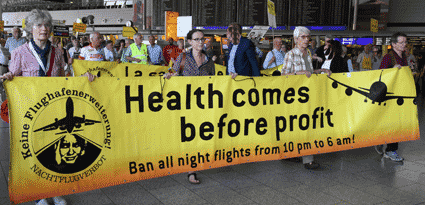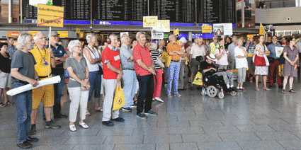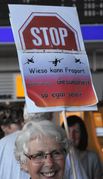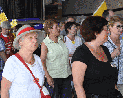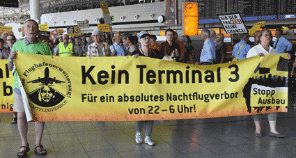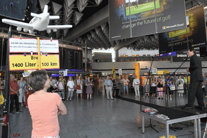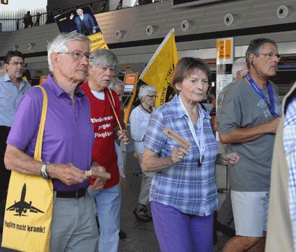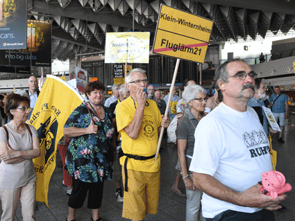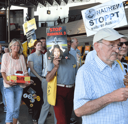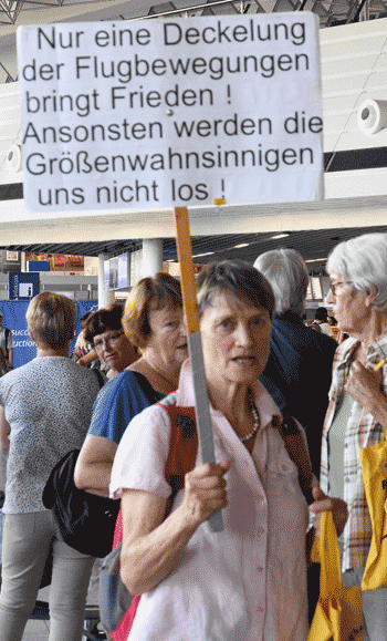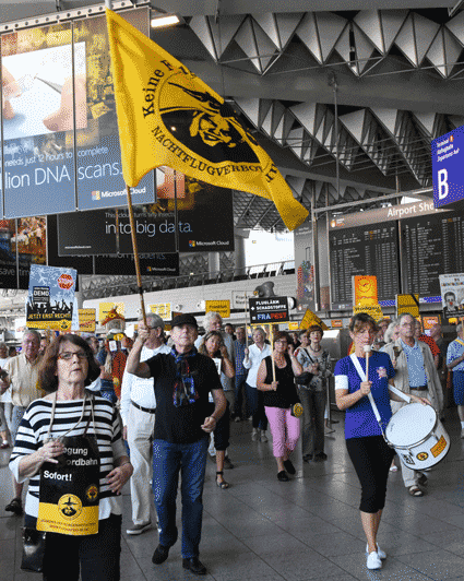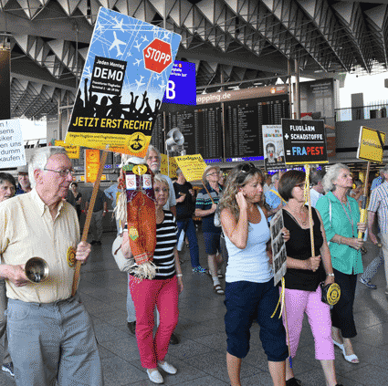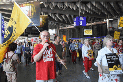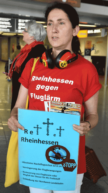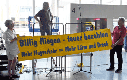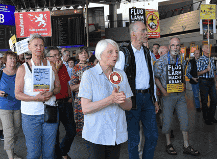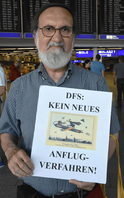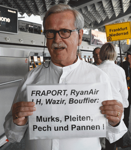 Das war in jeder Beziehung ein Höhepunkt: Der Auftritt eines hessischen Staatsekretärs bei der 215. Montagsdemo des gegen Ausbau und Umweltbelastungen des Rhein-Main-Flughafens kämpfenden Bündnisses der Bürgerinitiativen (BBI). Auch wenn das klassisch treffsichere Satire des Offenbacher Fluglärm-Aktivisten Hans Schinke war, der in der Vergangenheit auch als Pilot verkleidet Furore machte, es hätte tatsächlich so sein können, wenn wirklich ein Politiker bei der Protestaktion am 19. Juni 2017 gesprochen hätte! Hans Schinke parodierte nämlich gekonnt jenen jovialen bis nichtssagenden Redestil, den so mancher Politiker in Sonntagsreden pflegt: viel Pathos – wenig konkrete Aussagen. Themen des Abends im Terminal waren außerdem Billig-Fliegerei, ein Rückblick auf die erfolgreichen BBI-Auftritte beim Hessentag in Rüsselsheim sowie Ausblick auf kommende Aktivitäten wie die Mahnwache vor dem Kloster Eberbach zum Rheingau-Musik-Festival am Samstag, 24. Juni, 16.30 Uhr.