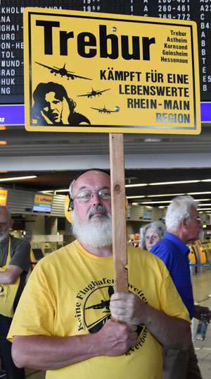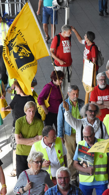 Mit der nunmehr 216. Montagsdemo und rund 300 Teilnehmern endete zum Abschluss des ersten Halbjahres 2017 die Reihe der montäglichen Protestaktionen des gegen Ausbau und Umweltbelastungen des Rhein-Main-Flughafens kämpfenden Bündnisses der Bürgerinitiativen (BBI). Dies war die letzte reguläre Montagsdemo vor den Sommerferien, in denen jedoch schon traditionell die kleineren Mahnwachen am gleichen Ort und zur gleichen Zeit stattfinden. Im Mittelpunkt der 216. Montagsdemo stand am 26. Juni eine Rede von Dr. Berthold Fuld, Vizepräsident der Bundesvereinigung gegen Fluglärm, zum Thema hessischer Landesentwicklungsplan und hierin die Passagen zum Frankfurter Airport. Außerdem berichtete Wilma Frühwacht-Treber (Interessengemeinschaft zur Bekämpfung des Fluglärms) über die anstehende 24. Minipressen-Messe in Mainz (29. Juni bis 2. Juli in der Rheingold-Halle), wobei auch das Buch-Projekt "50 Jahre Protest gegen den Ausbau des Frankfurter Flughafens" präsentiert wird. Darüber hinaus umrahmte Steve Collins mit Liedern zur Gitarre die 216. Montagsdemo musikalisch.