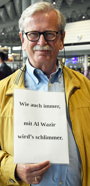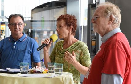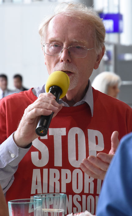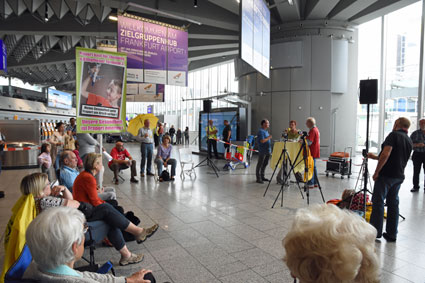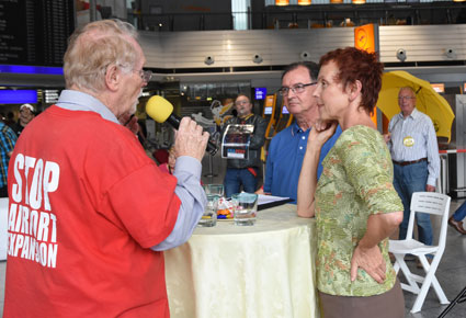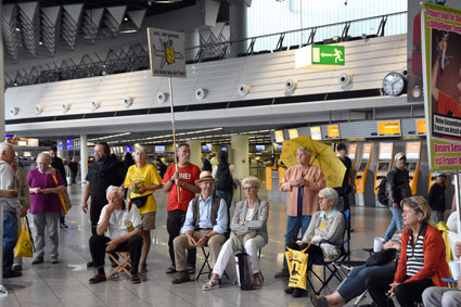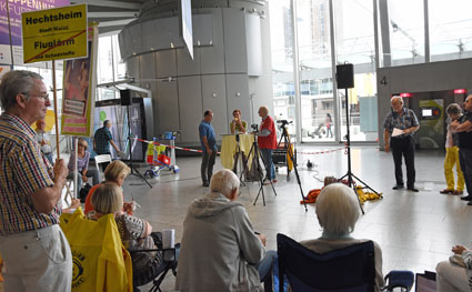 Am Montag, 24. Juli 2017, setzte das gegen den Ausbau und die Umweltbelastungen des Rhein-Main-Flughafens kämpfende Bündnis der Bürgerinitiativen (BBI) bei seiner 57. Mahnwache die Interview-Reihe mit Politikern/innen im Vorfeld der Bundestagswahl fort. Bei dieser vierten Mahnwache in den Sommerferien 2017 stellte sich Linke-Bundestagsabgeordnete Sabine Leidig (Bild 3), verkehrspolitische Sprecherin ihrer Fraktion in Berlin, den Fragen und bezog auch selbst Position: Hierbei stellte sich sich eindeutig auf die Seite der Protestbewegung. Das Gespräch führten von BBI-Seite Dietrich Elsner (Bild 4) und Joachim Alt (Bild 5), beide von den Bürgerinitiativen aus Mainz und Rheinhessen. Unsere anderen Bilder zeigen Szenen bei dieser Mahnwache im Terminal 1.