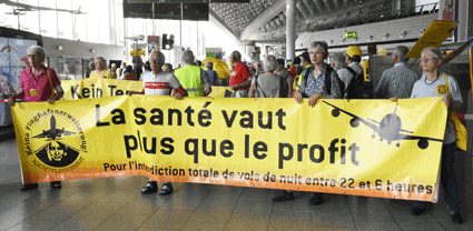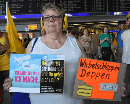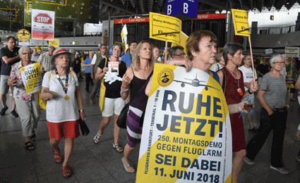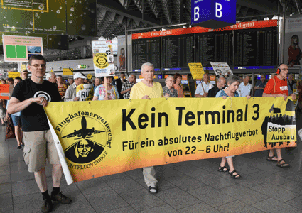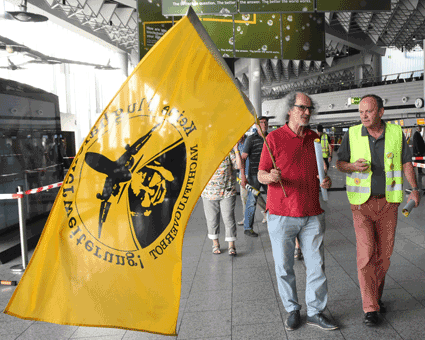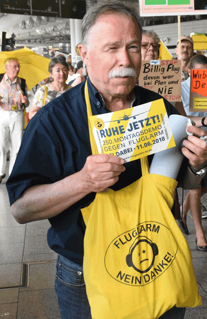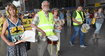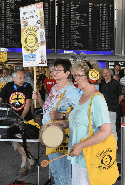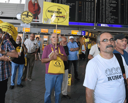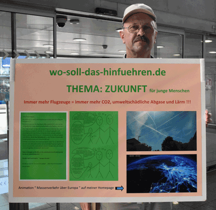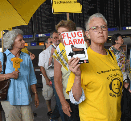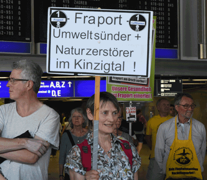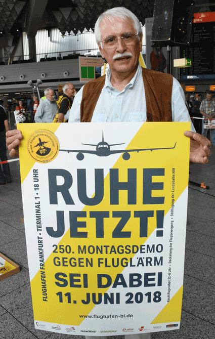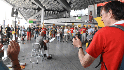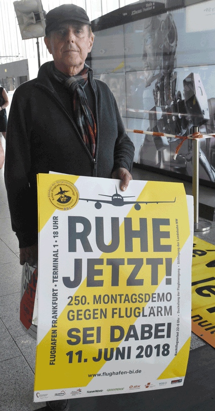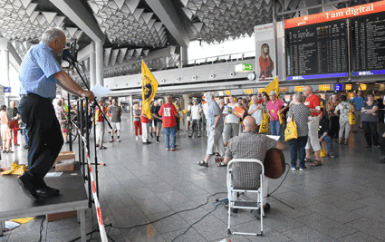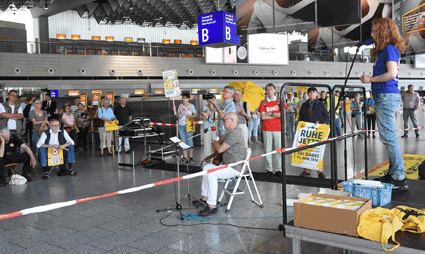 Der Countdown zur 250. Montagsdemo des gegen Ausbau und Umweltbelastungen des Rhein-Main-Flughafens kämpfenden Bündnisses der Bürgerinitiativen (BBI) läuft. Das wurde auch bei der 248. montäglichen Protestaktion im Terminal 1 am 28. Juni deutlich. So wurde auch diesmal Plakate und Flyer für diese Jubiläumsveranstaltung ausgegeben und für dieses Ereignis geworben. Außerdem trug dabei der Liedermacher Steve Collins (Fotos 1 und 2) Protestsongs vor, gab es Infos zum jüngsten Wirbelschleppen-Zwischenfall in Flörsheim (Foto 3 und 4) und nahm Wolfgang Heubner (Fotos 5 und 6) kritisch die Geschäftspolitik und -entwicklung der Flughafenbetreiber-Gesellschaft Fraport unter die Lupe.