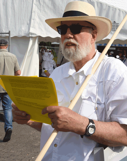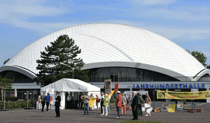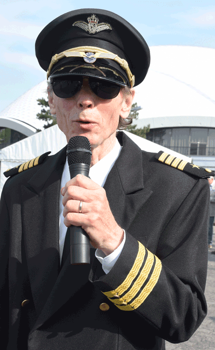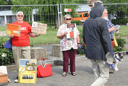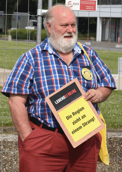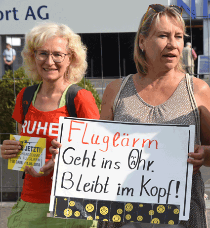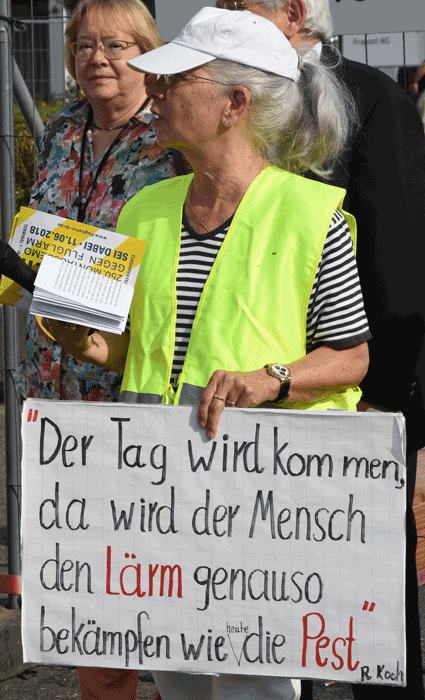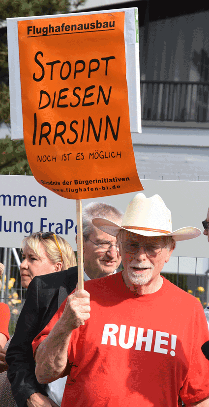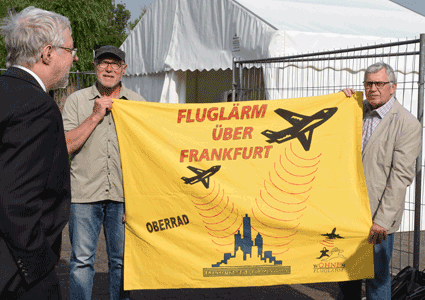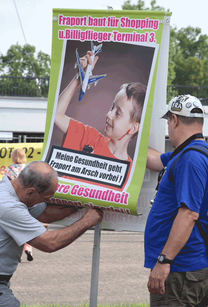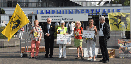 Wir sind kein Gegner des Flughafens – jedoch Gegner eines sozial nicht verträglichen Flughafenausbau, für ein Nachtflugverbot von 22 bis 6 Uhr sowie eine Deckelung der Flugbewegung auf 380000 im Jahr – so erklärten am Dienstag, 29. Mai 2918 Ausbaugegner/innen bei einer Protestaktion in Frankfurt-Höchst vor der Jahrhunderthalle. In der fand die alljährlich anberaumte Hauptversammlung der Flughafenbetreiber-Gesellschaft Fraport statt. Hans Schinke, als Pilot verkleidet, setzte sich kritisch auseinander mit dem Flughafen im Allgemeinen und mit der Geschäftspolitik sogenannter Billig-Fluglinien im Besonderen.