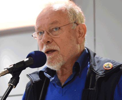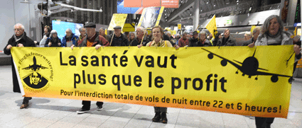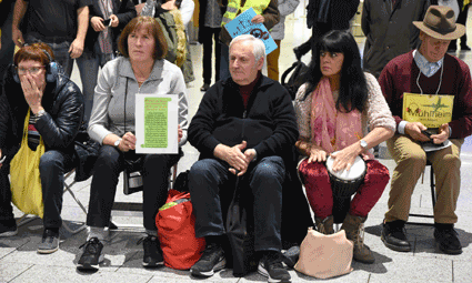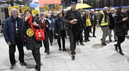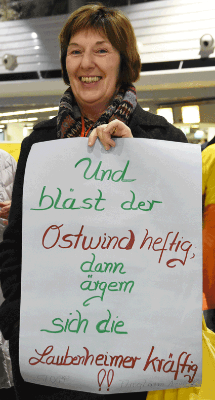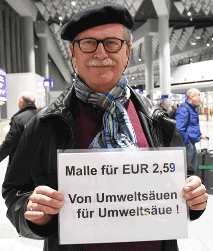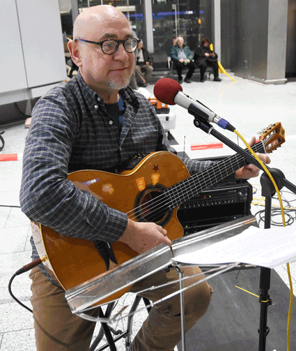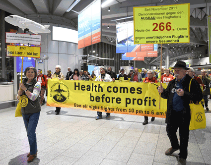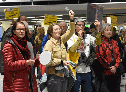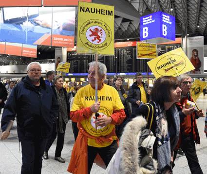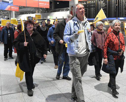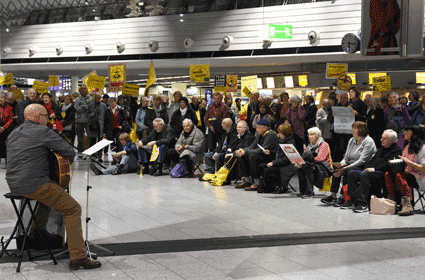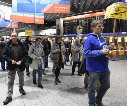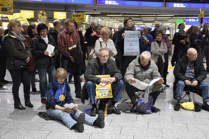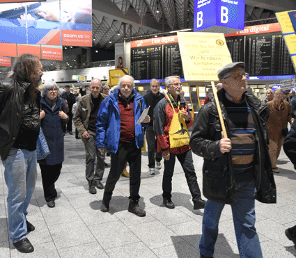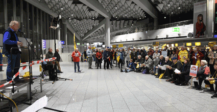 Diesmal stand der Protest-Umzug durchs Terminal im Mittelpunkt des Abends – so geschehen am 26. November 2018 bei der 266. Montagsdemo des gegen Ausbau und Umweltbelastungen des Rhein-Main-Flughafens kämpfenden Bündnisses der Bürgerinitiativen (BBI). Bei der kleinen Kundgebung moderierte Wolfgang Heubner (Bild 9), Bürgerinitiativen Sachenhausen, der auch aktuelles Datenmaterial über Umweltbelastungen durch den Flughafen präsentierte. Ein weiterer Schwerpunkt des Abends waren Protestsongs des Frankfurter Liedermachers Steve Collins (Bild 11).