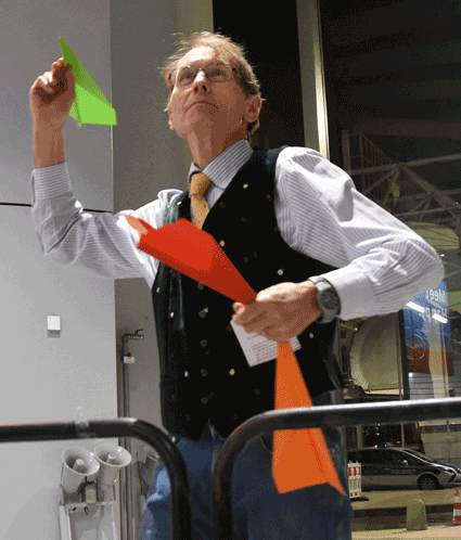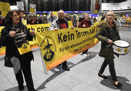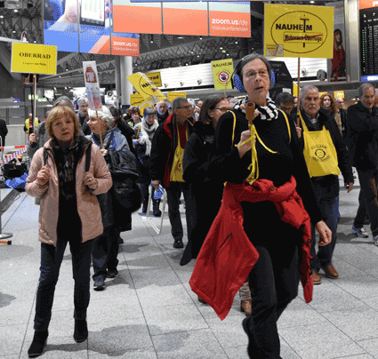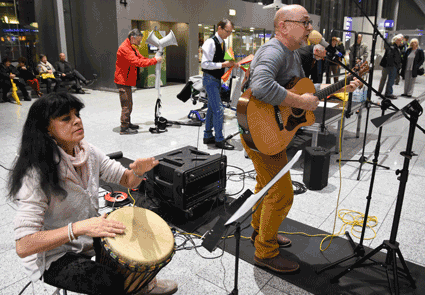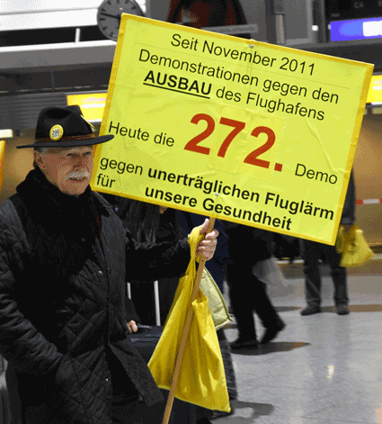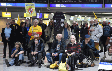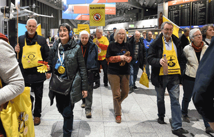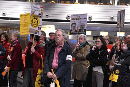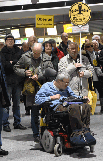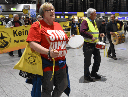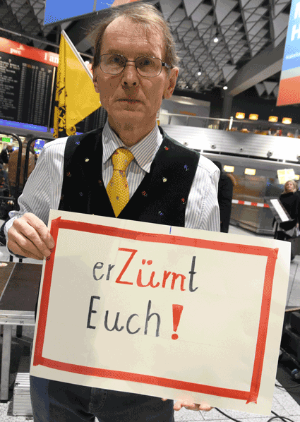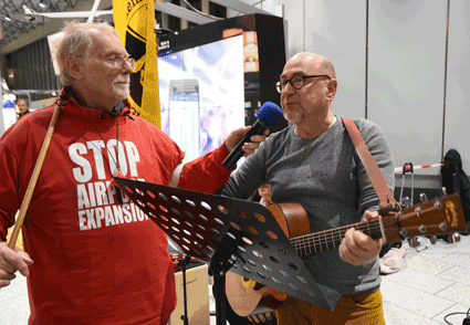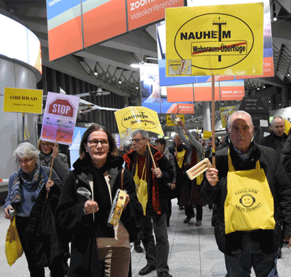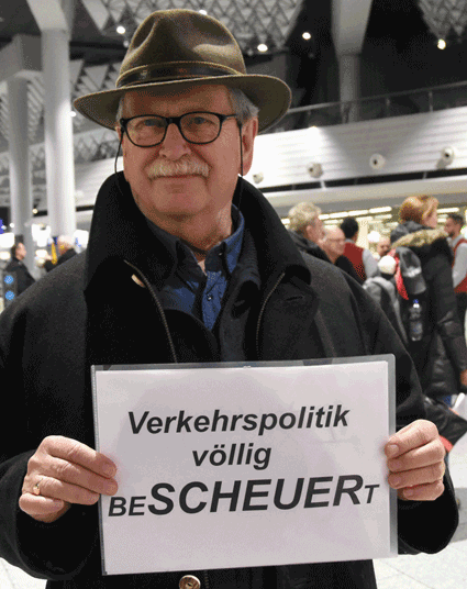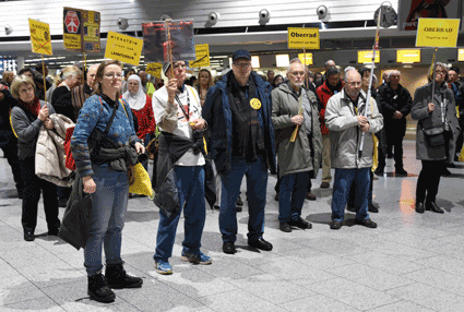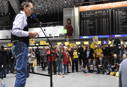 Das Thema "Verspätungslandungen" auf dem Rhein-Main-Airport und wie es Politiker sowie Flughafenbetreiber-Gesellschaft damit halten – das beleuchtete Hans Schinke (Fotos 2 bis 5), Offenbach, in der zentralen Rede bei der 272. Montagsdemo. Dazu hatte das gegen Ausbau und Umweltbelastungen des Frankfurter Flughafens kämpfende Bündnis der Bürgerinitiativen (BBI) zum 28. Januar 2019 ins Terminal 1 eingeladen. Dort ließ Hans Schinke ergänzend zu seinen Ausführungen spektakulär Papierflugzeuge – absolut geräuschlos und lärmfrei – zur optischen Untermalung fliegen. Moderiert wurde diese Montagsdemo wieder von Wolfgang Heubner (Bild 7), BI Sachsenhausen. Für musikalische Untermaldung der Protestaktion sorgten Monika Plottnik (Trommel) und Liedermacher Steve Collins (Gitarre), was die Fotos 8 bis 10 zeigen.