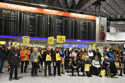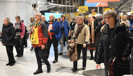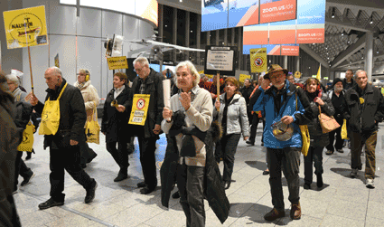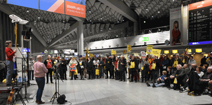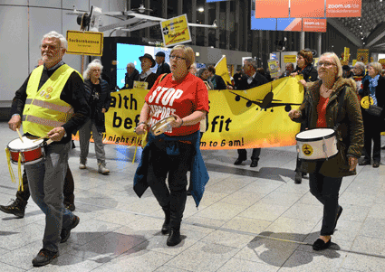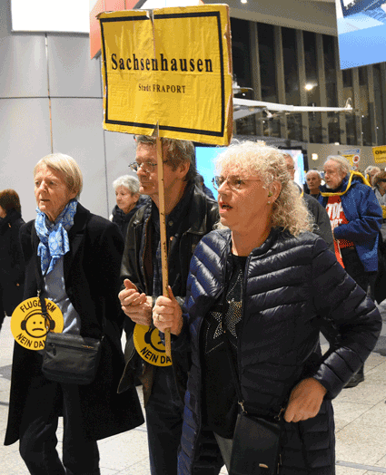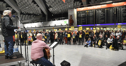 Über das Bündnis der Bürgerinitiativen (BBI), seine Struktur und Aktivitäten als Dachorganisation der gegen Ausbau und Umweltbelastungen des Rhein-Main-Flughafens kämpfenden lokalen Initiativgruppen gab es detailliert Auskunft bei der 273. Montagsdemo. Bei der berichtete am 4. Februar 2019 Michael Flörsheimer (Fotos 1 und 2), Mitglied des BBI-Sprechergremiums, zum Thema des Abends. Die Moderation der Protestveranstaltung lag in de Händen von Wolfgang Heubner (Foto 4), BI Sachsenhausen. Liedermacher Steve Collins (Foto 5), Frankfurt, bot eine gekonnte und mit eigenem Text unterlegte Version eines bekannten Songs der legendären Rocksängerin Janis Joplin.