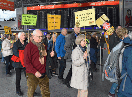 Bei der 282. Montagsdemo, der ersten regulären nach der Osterpause, standen am 6. Mai im Mittelpunkt die Beiträge von Christian Rau (Fotos 1 – 3) aus Mainz. Er trug Satire vom Feinsten vor: die ironische Verfremdung eines Briefs des Finanzministers an den Offenbacher Protest-Aktivisten Hans Schinke sowie ein satirisches Poem auf die in einer Flughafenbroschüre gefühlvoll geschilderte Rettung eines Uhus. Die ganze Demonstranten-Schar ging begeistert mit und Rau verbuchte einen enormen Heiterkeitserfolg. Die Demonstranten/innen wurden ebenfalls aktiv einbezogen in den von Liedermacher Steve Collins (Bild 4), Frankfurt, musikalisch be- und geleiteten Canon "He – jo, stoppt den Größenwahn, – Terminal drei und die Landebahn – Bringen nur Schaden – auf die Barrikaden". Moderiert wurde die montägliche Protestaktion des BBI im Terminal 1 von Dietrich Elsner (Bilder 5 und 6) vom Sprechergremium der Dachorganisation der Bürgerinitiativen. Der Kundgebung schloss sich der Protestumzug durchs Terminal 1 an, diesmal angeführt von einem Banner gegen Billigflieger.