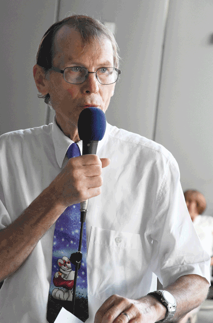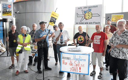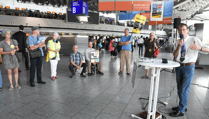 Mit der insgesamt 68. und in den Sommerferien 2019 ersten Mahnwache setzte am 1. Juli das Bündnis der Bürgerinitiativen (BBI) die Reihe der montäglichen Protestaktionen gegen den Ausbau und die Umweltbelastungen des Rhein-Main-Flughafens fort. Fast schon traditionell lädt das Bündnis in Ferien zu den kleineren Mahnwachen bevor nach den Urlaubswochen – so auch 2019 – wieder die regulären größeren Montagsdemonstrationen im Terminal 1 aufgenommen werden. Gestaltet wurde diese erste Mahnwache von Hans Schinke (Bild 5), Offenbach, der in seiner Rede - passend zur Ferienzeit - zu einer kritische Reise durch die Flughafenthematik einlud.