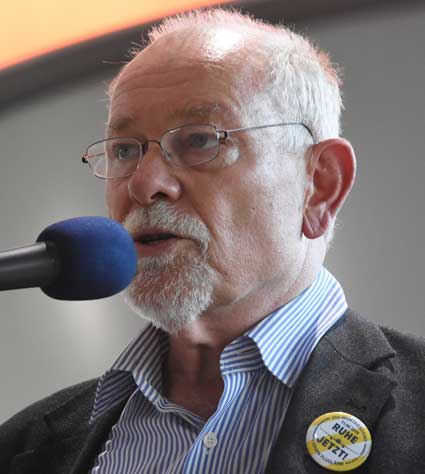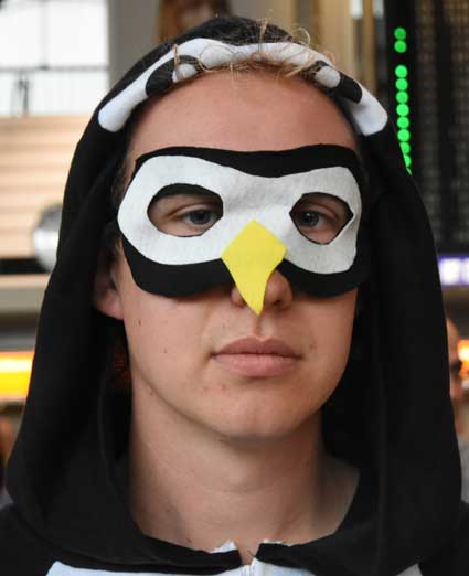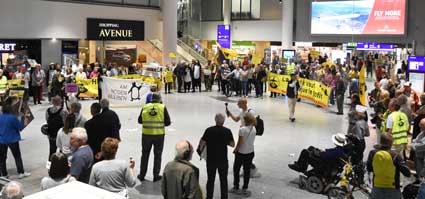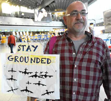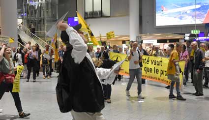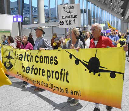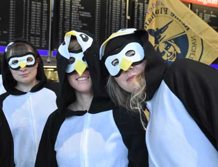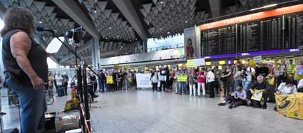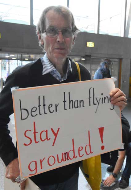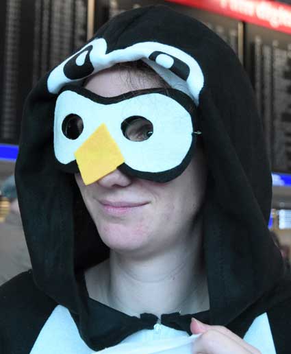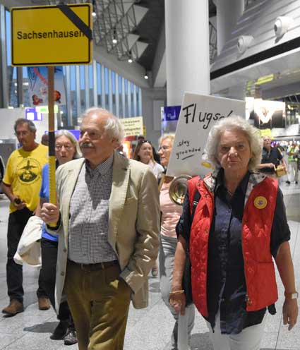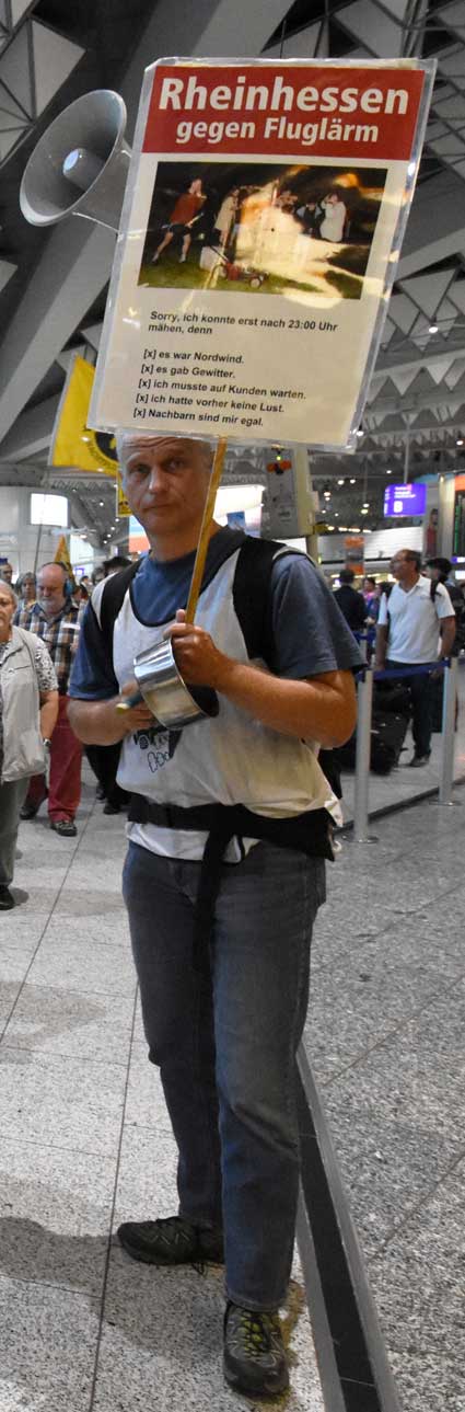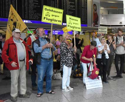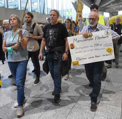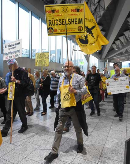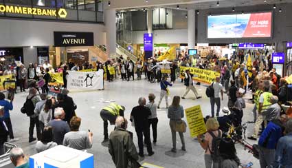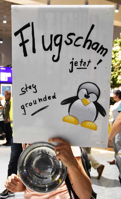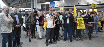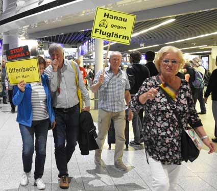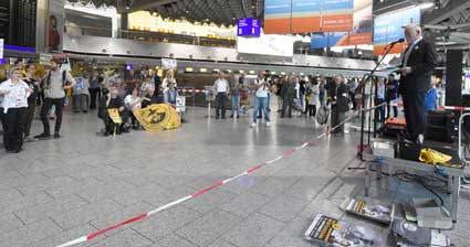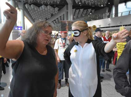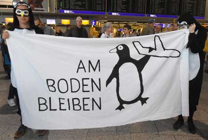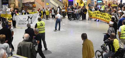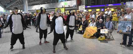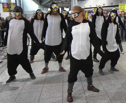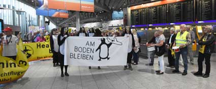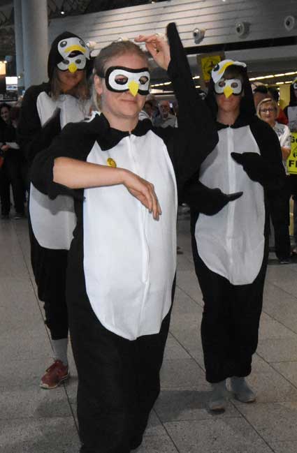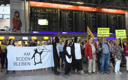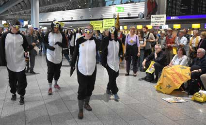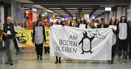 Es war beinahe wie im richtigen Leben, coole Pinguine beherzigern das Motto "Am Boden bleiben - Stay Grounded". So zu erleben bei der 296. Montagsdemo des BBI am 14. Oktober im Terminal 1 des Airports. Mit einer Pinguin-Gruppe waren diesmal auch Umweltaktivisten von "Am Boden bleiben dabei". Zum Flughafenausbau machten kritische Anmerkungen Petra Schmidt (Fotos 14 und 15), BI Mörfelden-Walldorf, sowie Wolfgang Heubner (Fotos 16 und 17), BI Sachsenhausen. – Unsere Bilder 20 bis 32 zeigen Szenen vom Protestumzug durchs Terminal nach dem Auftakt mit Kundgebung und Pinguin-Tanz.