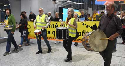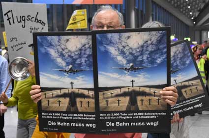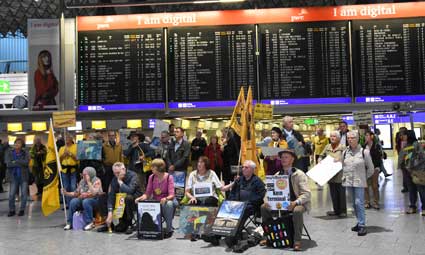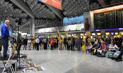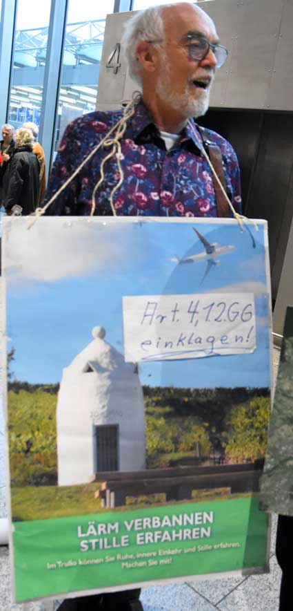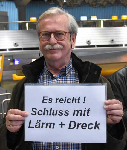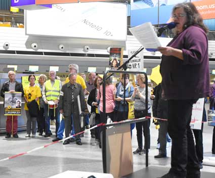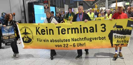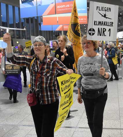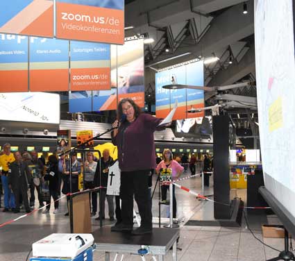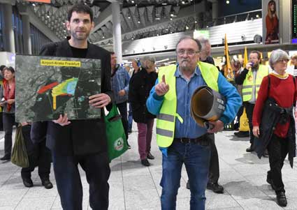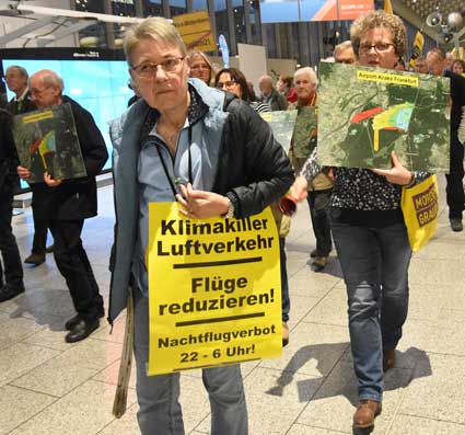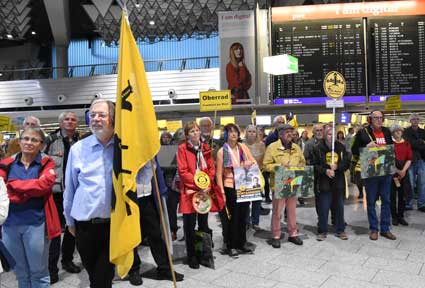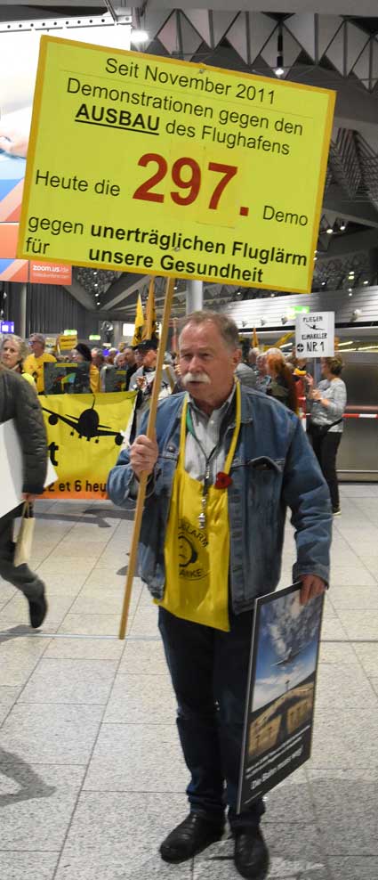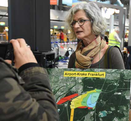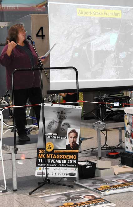 Wie die sprichwörtliche Krake fraß sich der Rhein-Main-Flughafen in mehreren Ausbaustufen in das Ballungsgebiet rund um Frankfurt im Laufe der Jahrzehnte hinein. Dies nahm zum achten Jahrestag der Inbetriebnahme der Landebahn Nord Petra Schmidt (Fotos 5 bis 8), BI Mörfelden-Walldorf, in einem beeindruckenden und vielbeklatschten Vortrag kritisch unter die Lupe bei der 297. Montagsdemo am 21. Oktober 2019. Sie zog den Bogen von den Anfängen über den Konflikt um die Startbahn West bis in die aktuellen Tage beim Bau des Terminals 3 - und wie immer mehr Wald im ohnehin schon ökologisch stark gebeutelten Rhein-Main-Gebiet für die Erweiterungen des Airports geopfert wurden. - Scharf kritisierte Wolfgang Heubner (Fotos 3 und 4), BI Sachsenhausen, die aktuellen Vorgänge um durch Schadstoffe belastete Erde beim Bau des neuen Terminals. Heubner kündigte dazu einen detaillierten Fragekatalog der Bürgerinitiativen an die Behörden an. Unsere Bild zeigen neben Szenen von der Kundgebung (Fotos 1 - 12 ) den Protestumzug (Fotos 13 bis 19) durchs Terminal 1 bei dieser Montagsdemo.