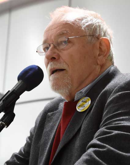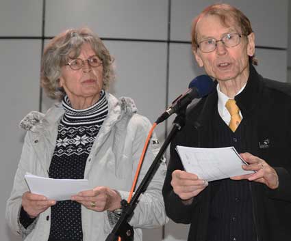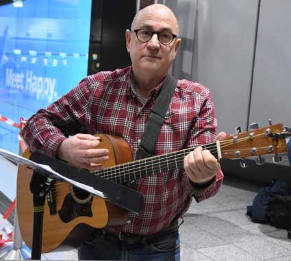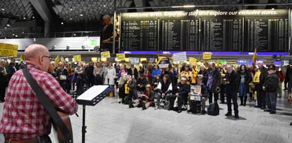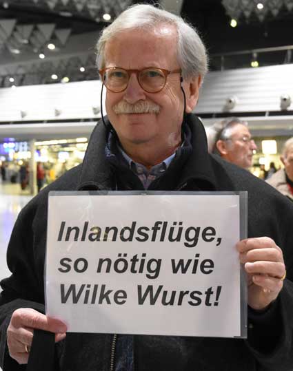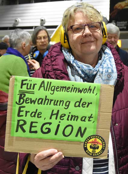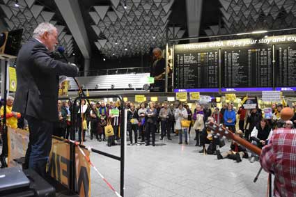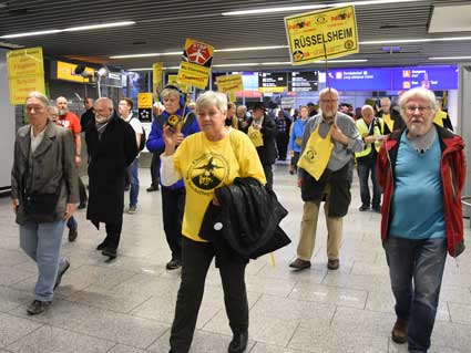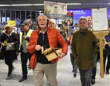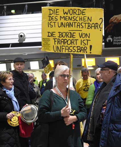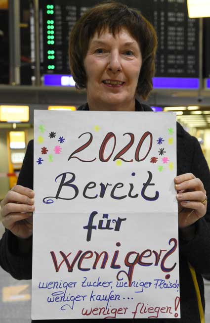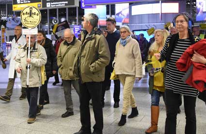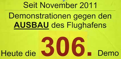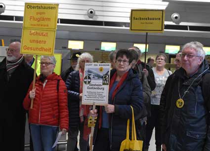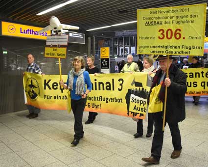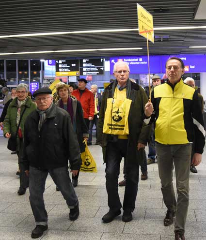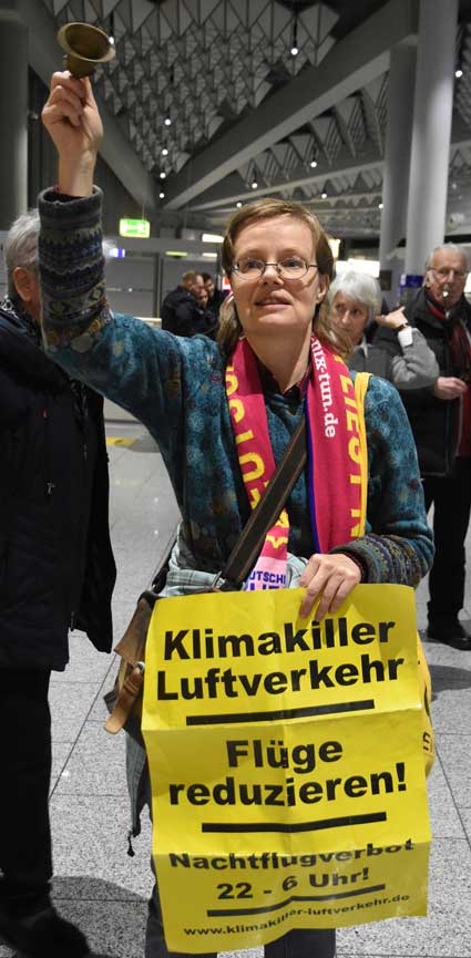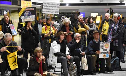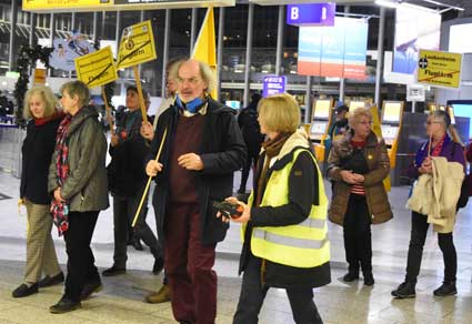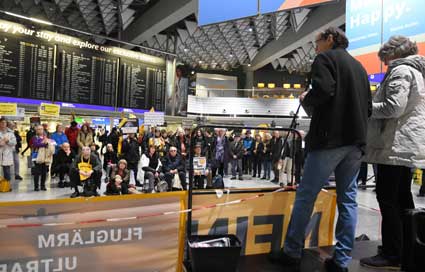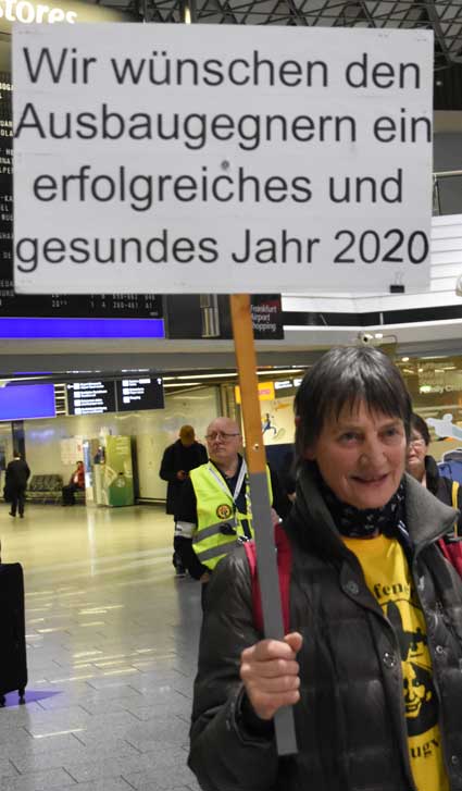 Auch 2020 gehen die Protestaktionen des BBI mit den Montagsdemos im Terminal 1 weiter. Das wurde mit der in diesem Jahr ersten und insgesamt 306. Montagsdemo am 13. Januar deutlich. Themen waren bei der von Knut Dörfel (Foto 6) moderierten Protestaktion unter anderem eine kritische Jahresbilanz 2019 rund um das Flughafengeschehen sowie die aktuelle Kontroverse um eine Deponie für belasteten Erdaushub an der Baustelle fürs Terminal 3. Liedermacher Steve Collins machte mit "We never walk alone" musikalisch klar, dass die Ausbaugegner/innen auch künftig ihren Protest mächtig und vereint vorantreiben wollen.