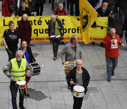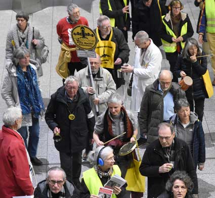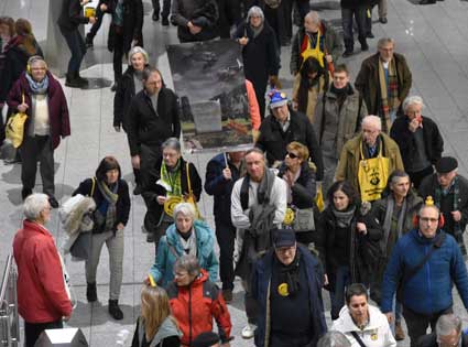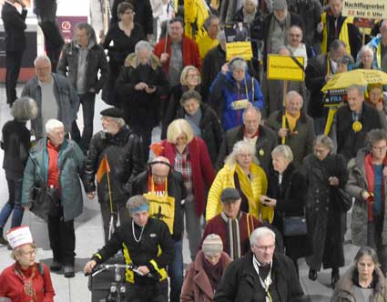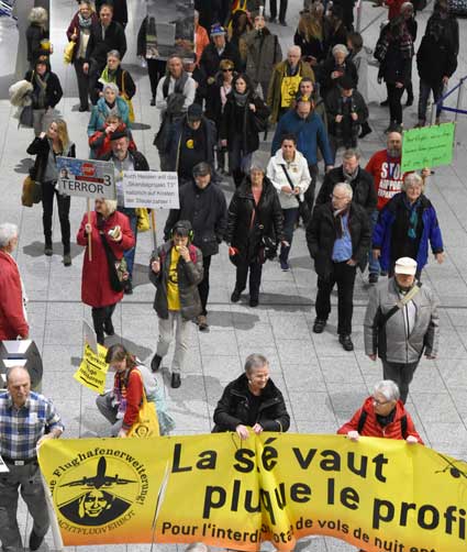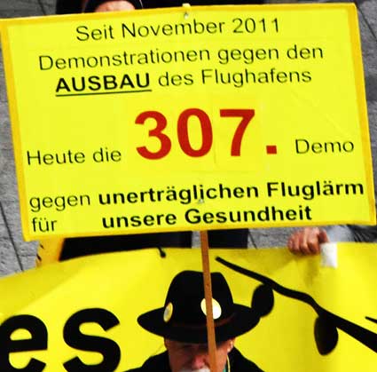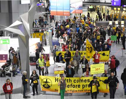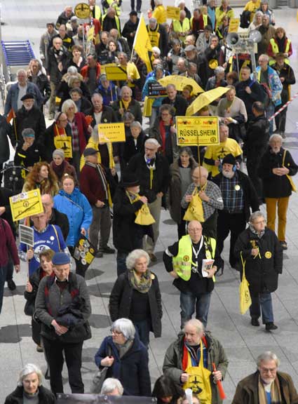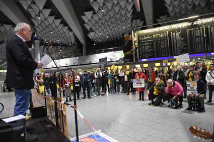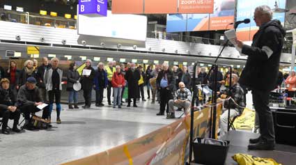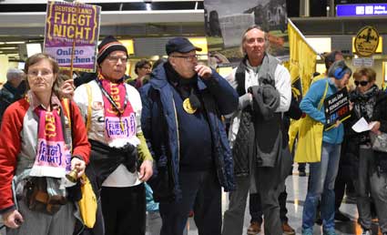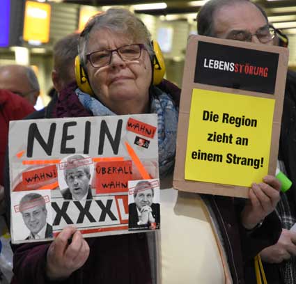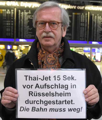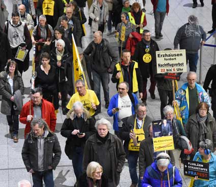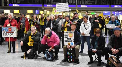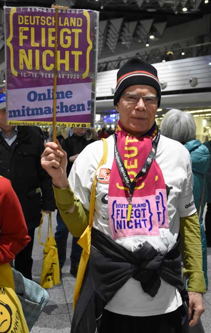 Bei der 307. Montagsdemo des gegen Ausbau und Umweltbelastungen des Rhein-Main-Flughafens kämpfenden Bündnisses des Bürgerinitiativen (BBI) nahm Wolfgang Heubner (Fotos 2 und 3), BI Sachsenhausen, als Moderator auch kritisch die Fraport-Pläne für eine Deponie von belastetem Erdaushub beim Bau des Terminals 3 unter die Lupe. - In der zentralen Rede des Abends zog am 20. Januar 2020 Karlheinz Neumann (Fotos 4 und 5), Frankfurt, in einem individuellen Jahresrückblick Bilanz, was die Protestbewegung erreicht hat. So habe sich die öffentliche Diskussion teilweise erheblich gewandelt, sei aufgeschlossener für Forderung zu mehr Umweltschutz und auch Kritik an Flughäfen und Luftverkehr. Dafür stünden beispielsweise die von vielen kritisch gesehenen Inlandsflüge. – Liedermacher Steve Collins (Foto 6), Frankfurt, trug kritische Texte zu von Elvis her bekannten Melodien vor. - t Unsere weiteren Bilder zeigen Szenen bei der Kundgebung zu Beginn der 307. Montagsdemo sowie vom anschließenden Protestumzug durchs Terminal 1.