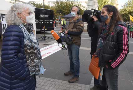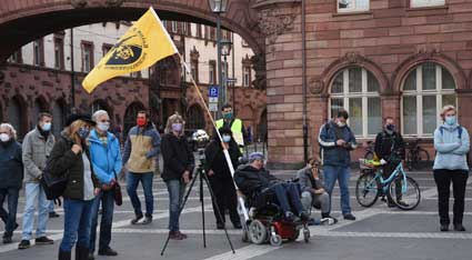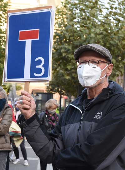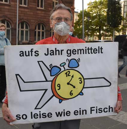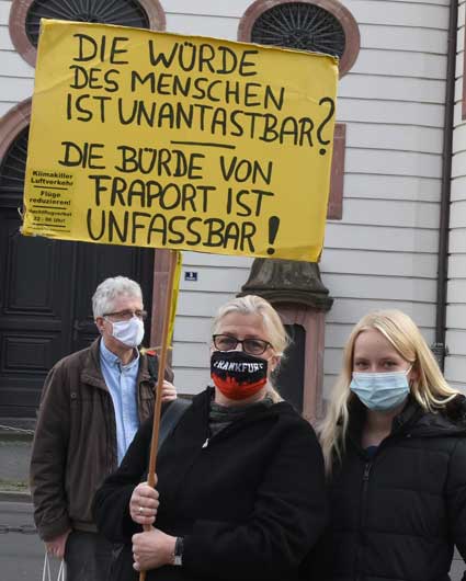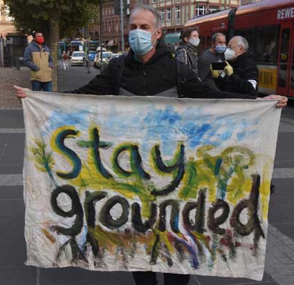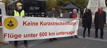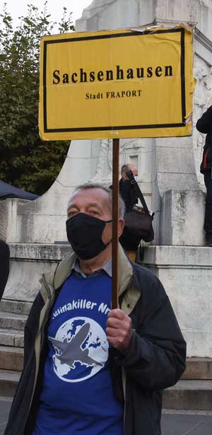 "Schluß mit dem Flughafenausbau - Schluß mit der Klimazerstörung und Umweltzerstörung", waren Forderungen bei der Kundgebung des gegen Ausbau und Umweltbelastungen des Rhein-Main-Flughafens kämpfenden Bündnisses der Bürgerinitiativen (BBI) am Mittwoch, 21. Oktober 2020, vor der