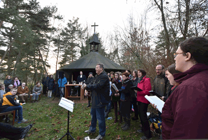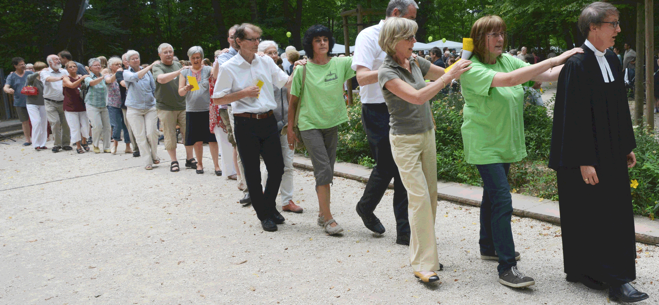 Wie ein Symbolbild zum Slogan “Einigkeit macht stark” wirkte am Sonntag, 19. Juli, beim evangelischen “Gottesdienst unter lautem Himmel” eine Gemeinschaftsaktion der Teilnehmer mit Pfarrerin Silke Alves-Christe (Bergkirche) am Goetheturm im Süden Frankfurt. Bei der gemeinsam von der Dreikönigsgemeinde und Bürgerinitiativen gegen den Fluglärm und den Ausbau des Rhein-Main-Flughafens gestalteten Protestaktion - nur äußerlich an eine Polonäse erinnernd – wurde zur Erklärung das Lied gesungen: “Viele kleine Leute an vielen kleinen Orten, die viele kleine Schritte tun, können das Gesicht der Welt verändern”. (Bild: Walter Keber)