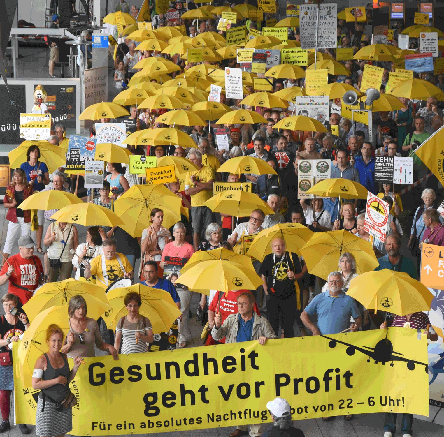 Gemeinsam unter gelben Schutzschirmen mit dem Anti-Ausbau-Logo präsentierten sich am 20. Juli über 500 Gegner/innen des Ausbaues des Rhein-Main-Flughafens beim Protestumzug durchs Terminal 1 anlässlich der 146. Montagsdemo des BBI – forderten spektakulär weniger Fluglärm und keinen weiteren Flughafenausbau. (Bild: Walter Keber - zum Vergrößern bitte auf das Bild klicken)