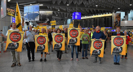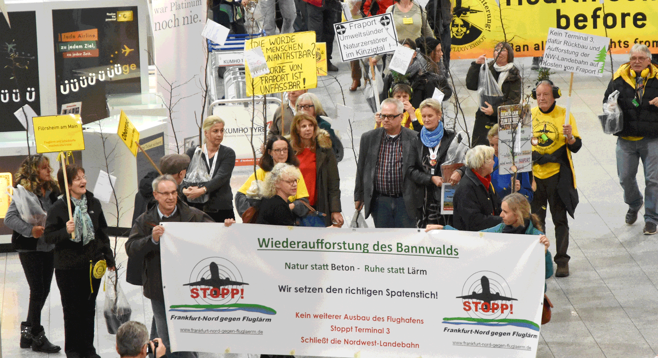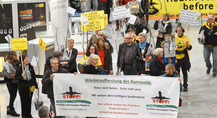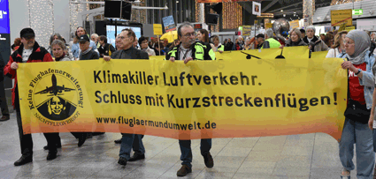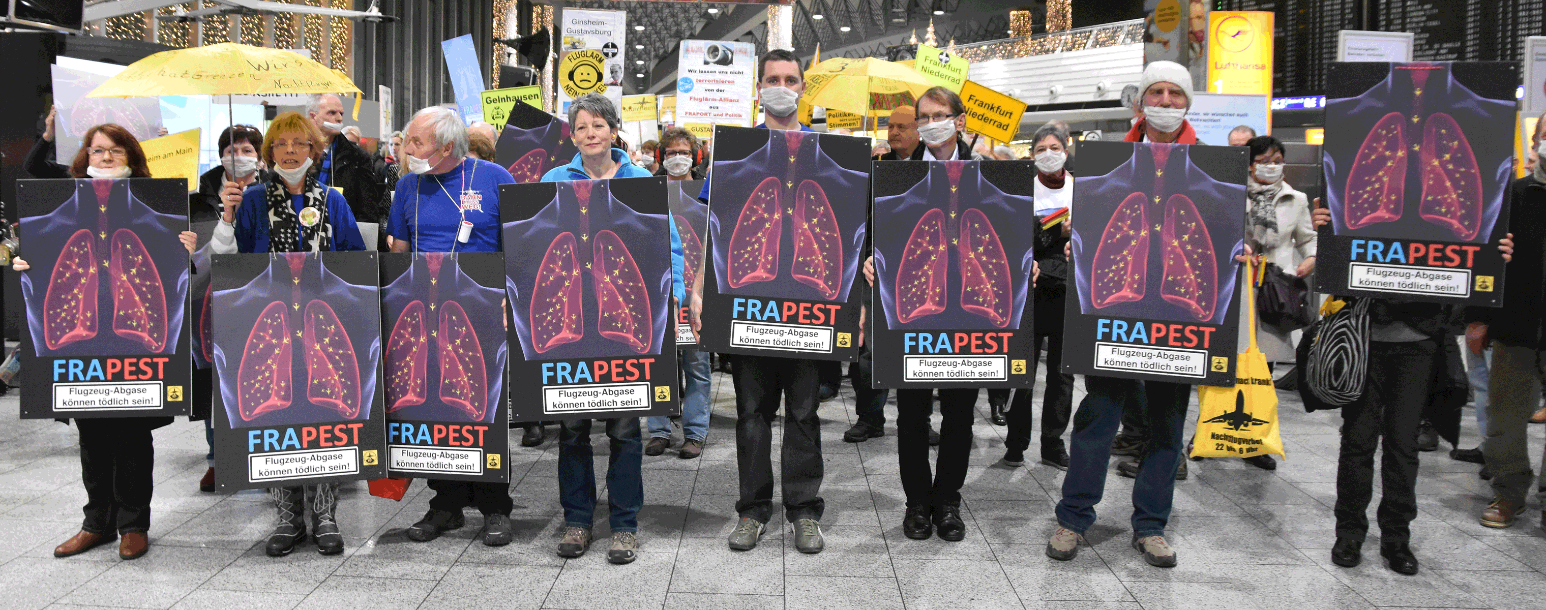 Unter dem Schlagwort “Frapest – Flugzeug-Abgase können tödlich sein” wurde bei der 159. Montagsdemo des Bündnisses der Bürgerinitiativen (BBI) das heikle Thema Feinstaub kritisch unter die Lupe genommen. Unser Bild zeigt eine Szene mit den Protestplakaten beim Umzug durchs Terminal 1.
