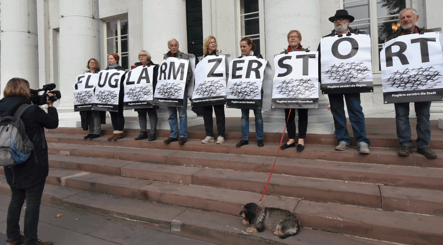 Fluglärmbetroffene aus dem ganzen Rhein-Main-Gebiet kamen vor dem Brahmskonzert, das von der Fraport AG gesponsert wurde, nach Wiesbaden. Beim Kurhaus prangerten sie den Ausbau- und Wachstumswahn der Verantwortlichen der Flughafenerweiterung an. Konzertbesucher und Passanten signalisierten ihnen mit Daumen nach oben, dass sie die Aktion gut finden – ebenso Orchestermusiker, die sich im Kurhaus warm spielten. Zwei Passanten schnappten sich spontan Plakate und stellten sich für eine Weile zu den Demonstranten. Der Abend des Herr Schulte dürfte aber eingetrübt gewesen sein, denn er musste an den Demonstranten vorbeifahren, die rechts und links mit ihren Schildern die Zufahrtsstraße zum Kurhausplatz säumten.