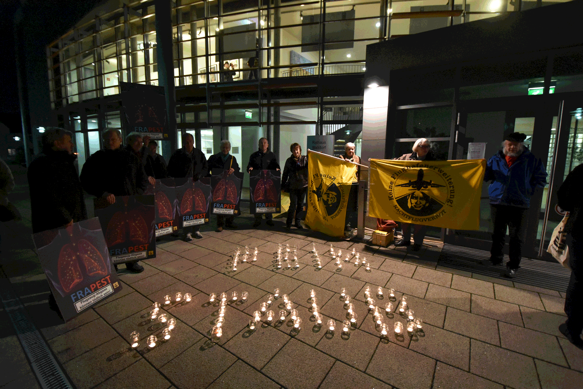 Das Wort "Feinstaub" hatten mit Kerzenlicht gebildet bei einer Mahnwache vor dem Walldorfer Rathaus Aktive mehrere Bürgerinitiativen gegen den Ausbau des Rhein-Main-Flughafens. So begleiteten die Protestierenden am Donnerstag, 3. Dezember 2015, eine Informationsveranstaltung der Stadt Mörfelden-Walldorf mit dem Forum Flughafen und Region sowie dem Umwelt- und Nachbarschaftshaus, in der Reihe "Wir und der Flughafen".