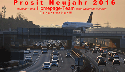 Warum es mit dem Protest weitergehen soll und muss, das macht dieses Bild klar – die Flughafen-Brücke über die Autobahn bei Kelsterbach von der Landebahn Nordwest zum Hauptteil des Frankfurter Flughafens: Lärm, Abgase, Verkehrswachstum, Zerschneidung und Betonierung des im dicht besiedelten Ballungsraum Rhein-Main so dringend benötigten Waldes. In diesem Sinne wünscht das Homepage-Team des Bündnisses der Bürgerinitiativen (BBI): Prosit Neujahr 2016. (Bild: Walter Keber)