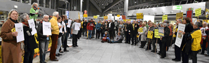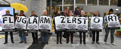 Jeden Montag 18 Uhr – bringen wir den Krach retour, so lautete das Motto auch am 7. März 2016 bei der nunmehr 169. Montagsdemo des gegen die Umweltbelastungen des Rhein-Main-Flughafens kämpfenden Bündnisses der Bürgerinitiativen (BBI). Unser Bild zeigt eine Szene bei einer "Lärmpause" während des Umzugs durchs Terminal 1, wobei unterwegs bei solchen Pausen getreu dem abendlichen Motto bewusst gelärmt wurde. Außerdem wurde wie im richtigen Leben bei den Lärmpausen über Rhein-Main auch in diesem Fall der Lärm nur verschoben, nämlich von den hochbelasteten An- und Abflugschneisen rund um den Airport zurück zum Verursacher ins Terminal! (Bild: Walter Keber)