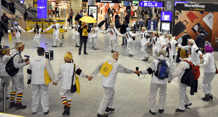 Weil der Mainzer Rosenmontagszug wegen schlechten Wetters ausfiel, reisten die gegen den Ausbau des Rhein-Main-Main-Flughafens und dessen Umweltbelastungen kämpfenden Bürgerinitiativen, die an diesem Großereignis wieder mit einer Gruppe hatten teilnehmen wollen, ersatzweise und kurzentschlossen zu einer Fastnachts-Demonstration ins Terminal. Pünktlich um 11.11 Uhr ging dort es los.(Bild: Walter Keber)