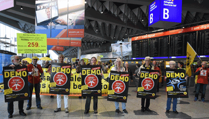 Mit der 252. Montagsdemo nahm am 6. August 2018 das gegen Ausbau und Umweltbelastungen des Rhein-Main-Flughafens kämpfende Bündnis der Bürgerinitiaven (BBI) nach den Sommerferien wieder die Reihe seiner regulären montäglichen Protestaktionen im Terminal 1 des Airports auf. In den zurückliegenden Ferienwochen waren dort lediglich kleinere Mahnwachen mit Politiker-Interviews durchgeführt worden.(Bild: Walter Keber)