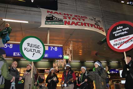 der Aufschrift „Nachtzug statt Nachtflug“. Sie fordern damit von der