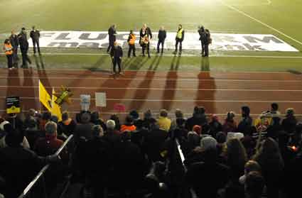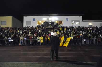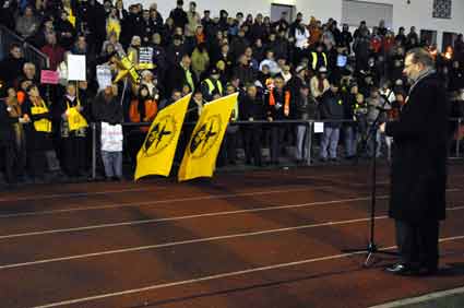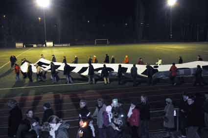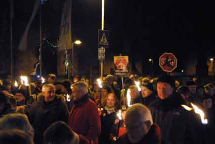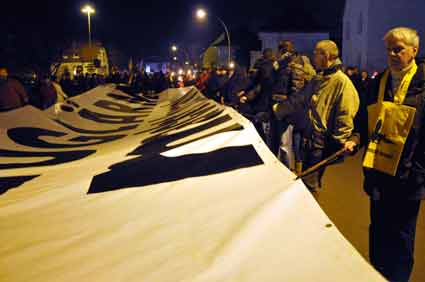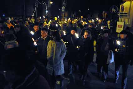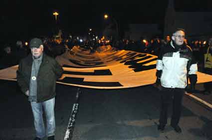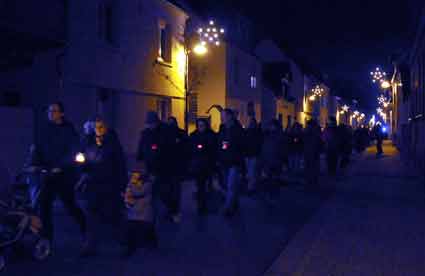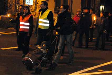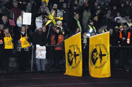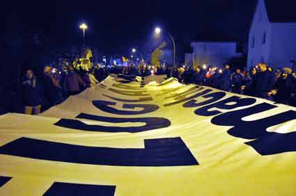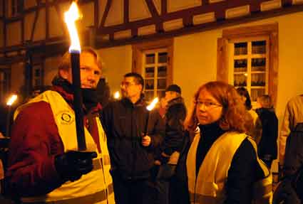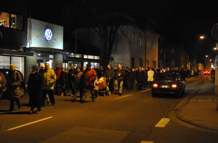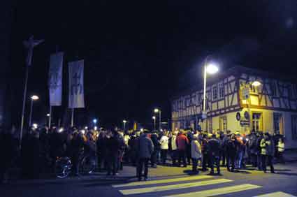 Die Aktion fand in Form eines Sternmarsches von drei Stellen im Stadtgebiet zu einer zentralen Kundgebung statt. Die Foto-Strecke beginnt an der katolischen. St. Gallus-Kirche und geht durch die Stadt zum Vereinsgelände und Sportplatz des SV 09 Flörsheim. Mitgeführt wurde unter anderem das große Transparent "Fluglärm macht krank", das die Flörsheimer spektakulär am 21. Oktober 2011 bei ihrer Protestaktion zur Inbetriebnahme der Landebahn Nordwest und dem Anflug von Bundeskanzlerin Merkel ausgelegt hatten. Dieses große Transparent wurde am Freitagabend auf dem Sportplatzgelände präsentiert. Bei der Kundgebung sprachen unter anderem Hans Jakob Gall (Verein Für Flörsheim) und Flörsheims Bürgermeister Michael Antenbrink.