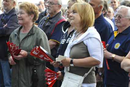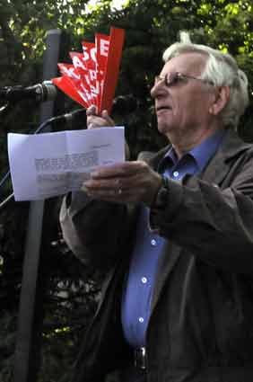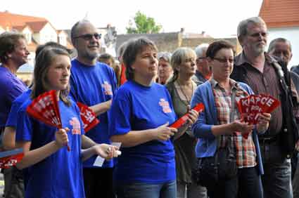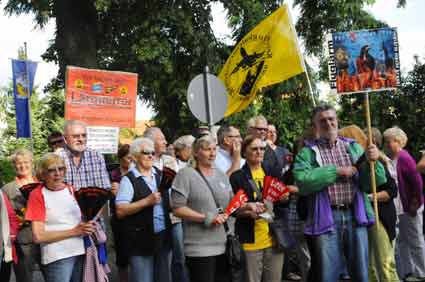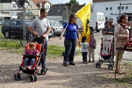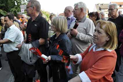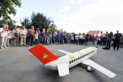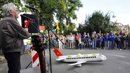 Ein Mehrzweckgeräte der Protestbewegung gegen den Frankfurter Flughafenausbau bestimmte in Flörsheim am Freitagabend bei einer vom Verein "Für Flörsheim" organisierten Kundgebung auf dem Rathausplatz die Szene. Vereinsvorsitzender Hans Jakob Gall stellte eine Klatsche (für die Fraport) vor, die gleichzeitig als wohltuender Fächer für frische Luft fürs Fluglärmgeplagte Flörsheim genutzt werden kann. Außerdem stand ein überdimensionales Flugzeugmodell als Hinweis auf die Verursacher der unerträglichen Lärmkulisse über der Stadt im Mittelpunkt der von über 300 Bürgern besuchten abendlichen Aktion.