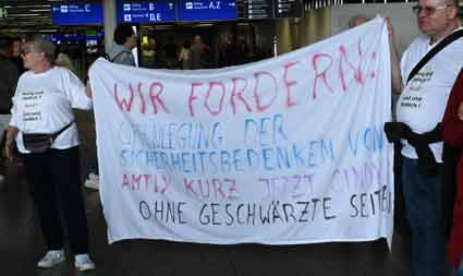 Bei der BBI-Kundgebung am 13. September 2025 anlässlich des Internationalen Tages Nachtflugverbot nahmen auch neue Protestierende teil, die besonders gegen die neue Abflugroute Cindy S sind, im Terminal 1 des Airports teil, um so gegen den Ausbau und die Umweltbelastungen des Rhein-Main-Flughafens Flagge zu zeigen. Unser Bild zeigt eine Szene bei dem samstäglichen Protest in Frankfurt.