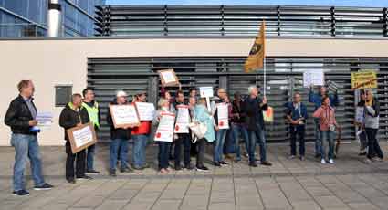 "Der Fluglärmkommission zeigen, was wir von Cindy-S halten" - mit diesem Slogan protestierten spektakulär am 17. September 2025 vor dem Rathaus in Raunheim, wo die Fluglärmkommission des Rhein-Main-Airports tagte, Vertreter*innen mehrerer Bürgerinitiativen gegen die neue Abflugroute Cindy S des Frankfurter Flughafens und damit einhergehende Umweltbelastungen. Unser Bild zeigt eine Szene beim Protest vor dem Bürgersaal des Raunheimer Rathauses.