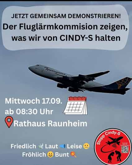 Aus aktuellem Anlass weisen wir auf eine Aktion der Initiative "Stopp CINDY-S" am 17.09.2025 ab 8.30 Uhr am Rathaus Raunheim hin: Der Fluglärmkommission zeigen, was wir von CINDY-S halten!